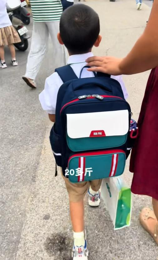 老来得子,谢东自然非常宠爱!看着儿子背的大书包,他跟在后面心疼地吐槽:“小家伙带上套了!我昨天称了一下,这个书包重20多斤。”