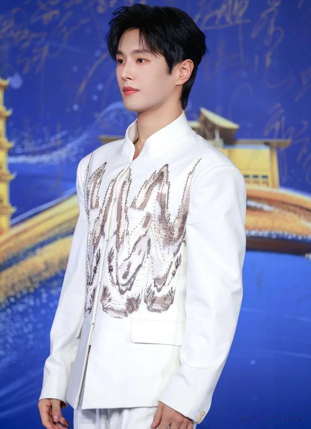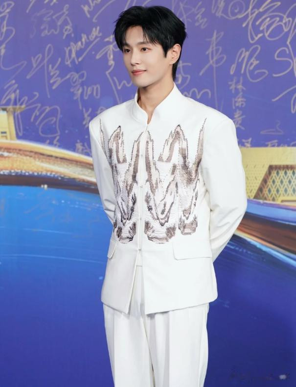 这次他穿着一件新中式的白色西装,衣服上面画得像是一幅山水画一样。