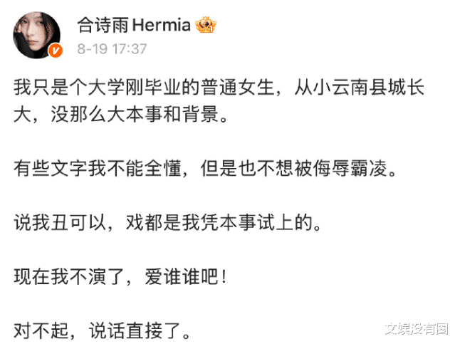 随后,合诗雨本人亦在微博发文,情绪明显低落:“我只是云南小县城走出来的普通女孩,没背景也没本事……现在我不演了,爱谁谁吧!”言语间疑似彻底退出剧组,告别角色。