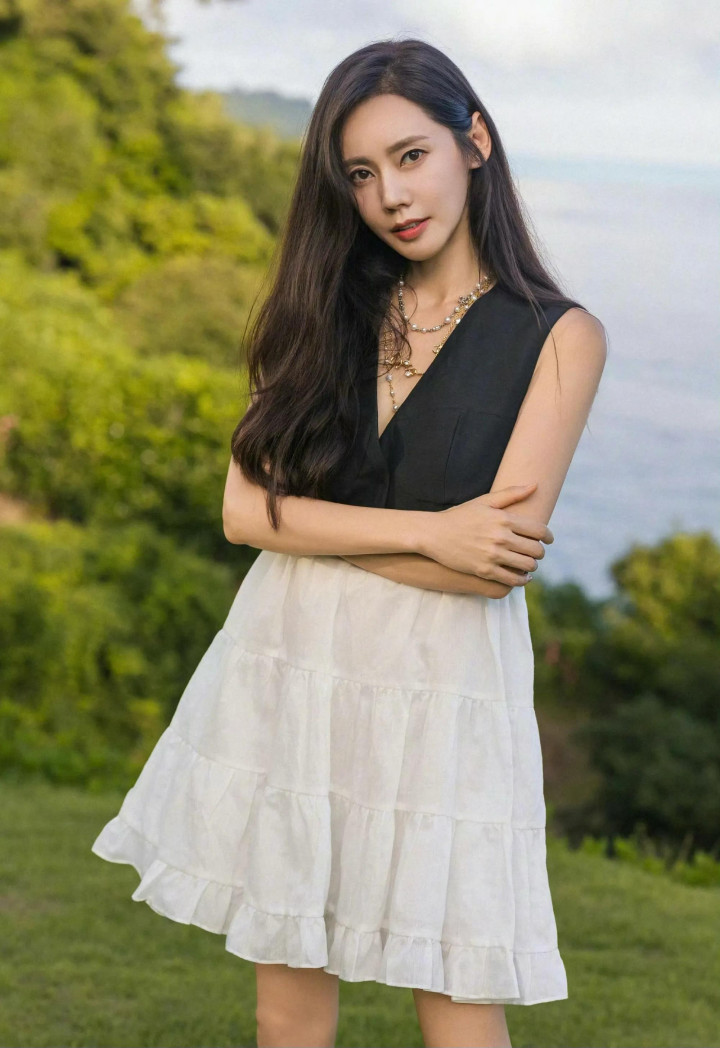 另一套黑白拼接裙则展现了秋瓷炫对时尚的细腻理解。上半身的黑色无袖延续了利落感,与下半身的白色蛋糕裙形成鲜明对比,刚柔并济间尽显设计巧思。蛋糕裙的层层褶皱不仅增添了造型的立体感,还自带减龄效果,让整体风格在简约中透着甜美。