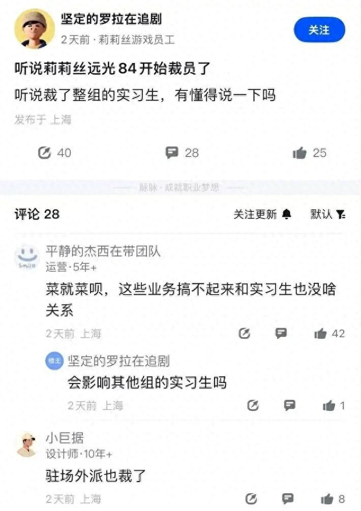 莉莉丝员工发帖称,远光84项目开始裁员了。而且是裁掉了整组的实习生。后续有网友补充,这次裁员针对的不仅仅是实习生,连驻场外派也裁员了。