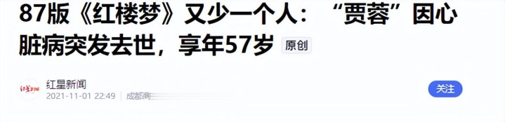 红星新闻——87版《红楼梦》又少一人,贾蓉因心脏病突发去世