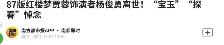 南方都市报——87版红楼梦贾蓉饰演者杨俊勇离世!“宝玉”“探春”悼念