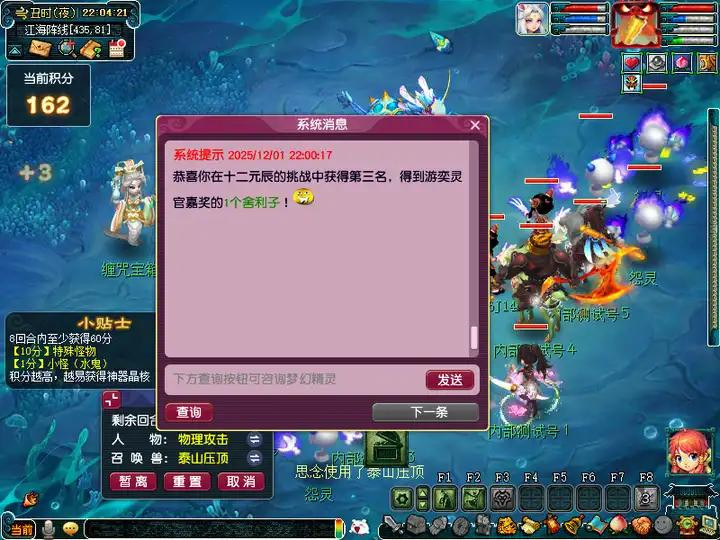 目前正常双龙挂机,所以比较闲,有10W以内的凌波三法和4女魃的问题可以问我,一般睡前会回复。